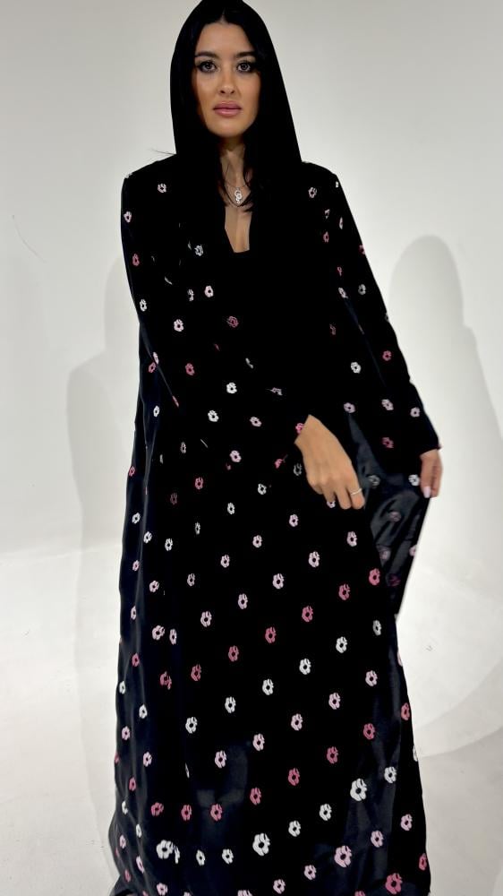 الحل هو عباية بلاك بيري بتطريز ورد من فوزانا – تصميم اللي يخطف الأنظار بتفاصيله الوردية الفاخرة