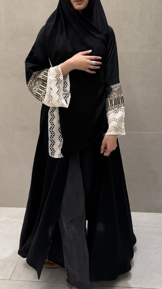 قماشها المخرم بتدخيله راقية وطرحتها المتناسقة يكملوا الإطلالة بأناقة متكاملة.