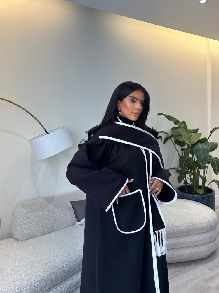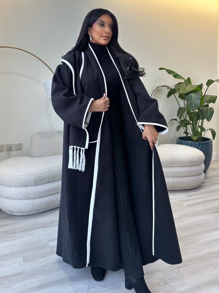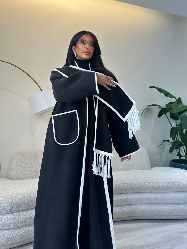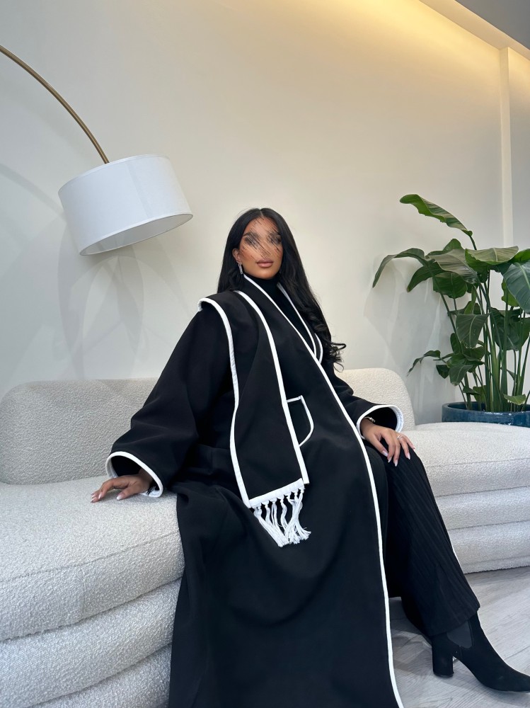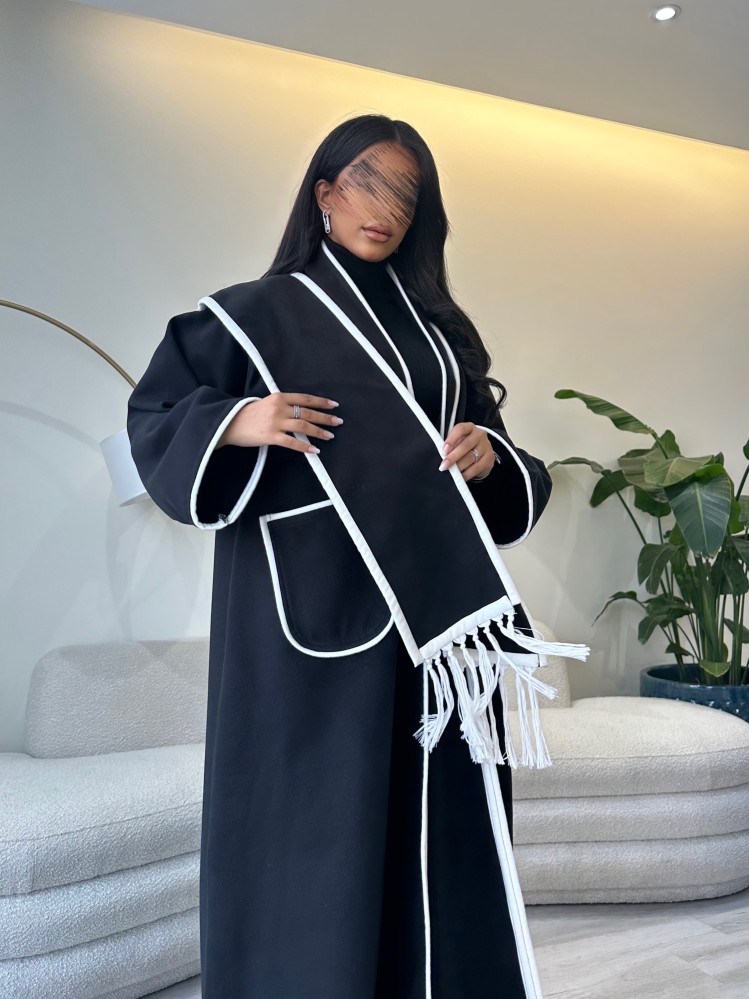 عباية جوخ نص كلوش أسود وأبيض من أجمل عبايات كولكشن شتاء 2024، مصممة وفق قصة نصف الكلوش المريحة ومن أجود أنواع قماش الجوخ الثقيل باللون الأسود مع تدخيلات من الأبيض، تمنحك الدفء والأناقة بنفس الوقت.