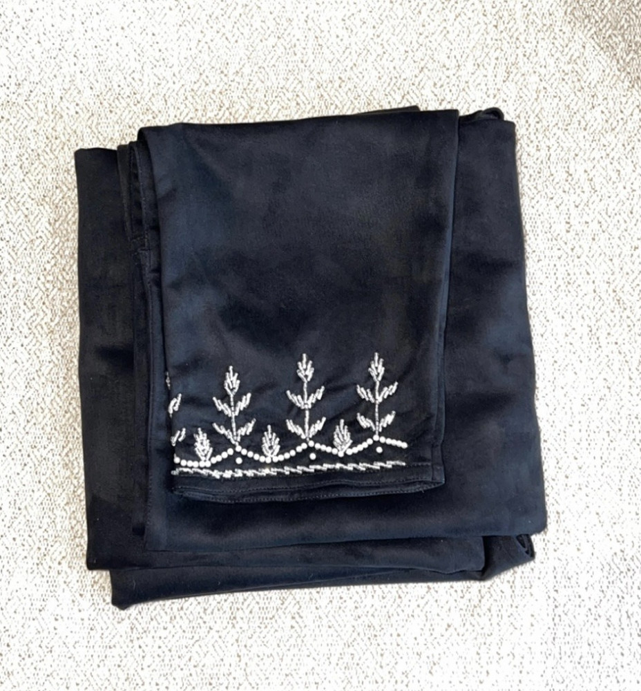 عباية صيفية باللون الأسود الملكي لإطلالة عصرية، تتناسب مع جميع التنسيقات الكاجوال والشيك فهي منسوجة من القماش الملكي مع تطريز وشك لولو أبيض يدوي على الأكمام، تأتي العباية مع طرحة سوداء مع تطريز مميز على الأطراف.